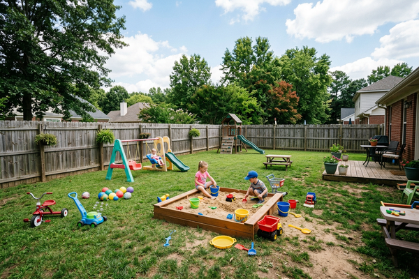 Our fully fenced outdoor oasis features a large sandbox, riding toys, and nature exploration areas for daily fresh air and gross motor development.