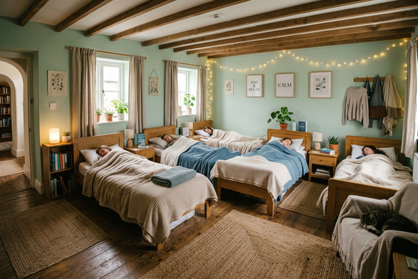 A quiet, soothing environment with comfortable cots, soft lighting, and gentle white noise to ensure restful sleep for growing bodies.