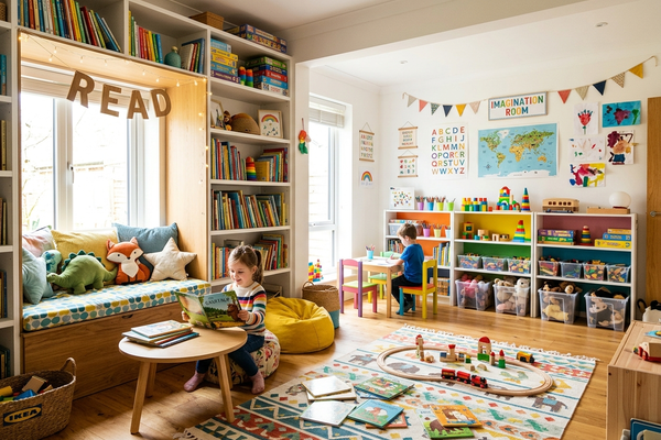 A bright, open space filled with age-appropriate toys, a cozy reading nook, and plenty of room for imaginative play and building.